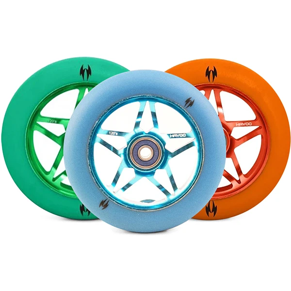 All of our 120mm Havoc Pro Scooter wheels come with our Havoc Pro bearings, with a rating of 85-88 Pu, they are a perfect blend of rebound and stiffness making for a smooth and fast ride. The 120mm wheels are perfect any type of riding, but really make all the difference with big air park style riding, We have plenty of colour combinations to pick from.