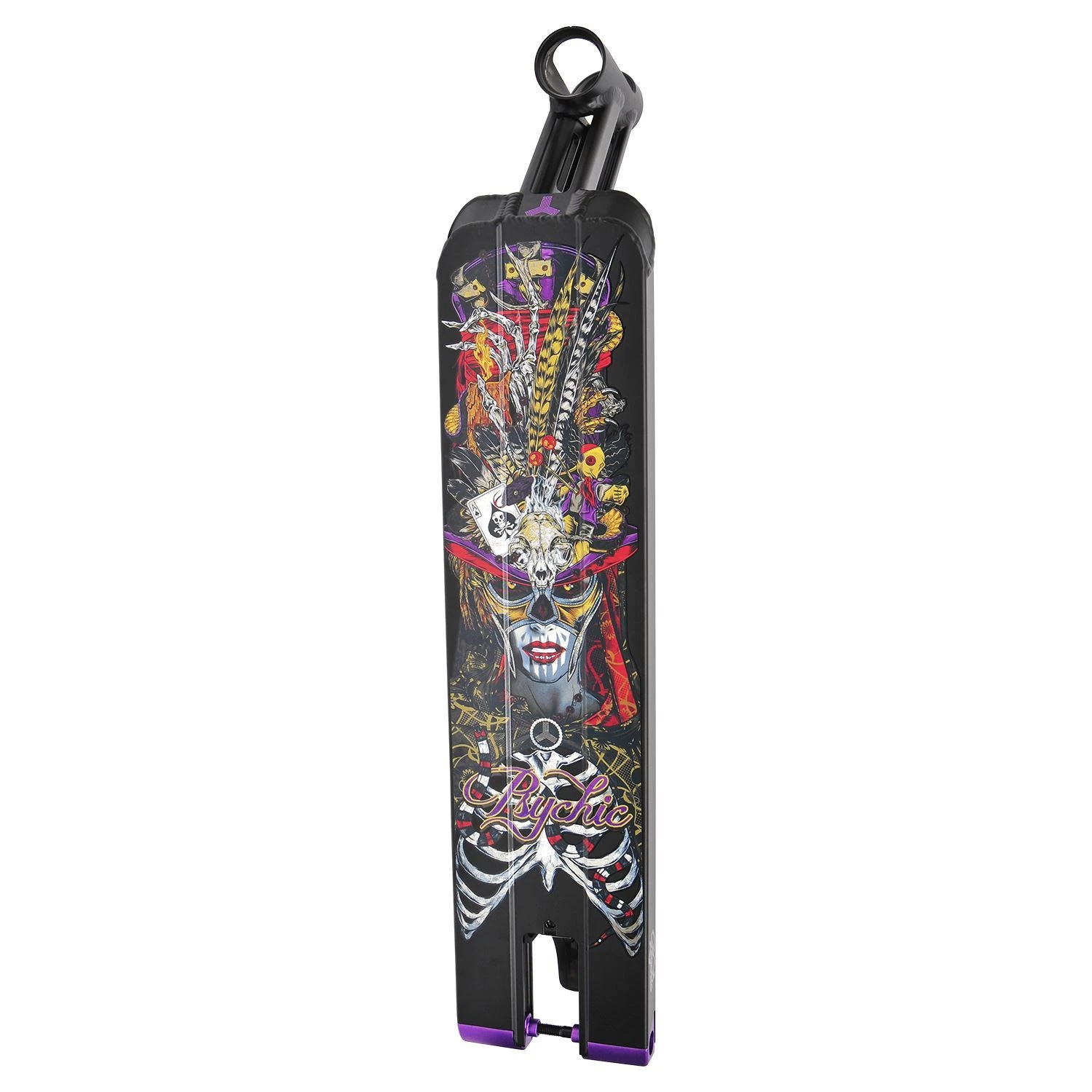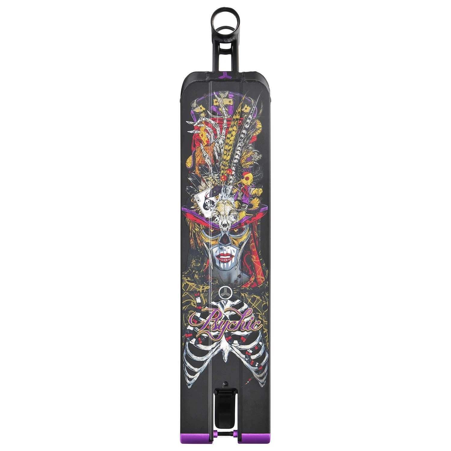 Our new Psychic deck was styled from our original Medusa deck but significantly refined to reduce weight and improve function. Featuring the new V2 Fend Off brake system, lightweight but strong neck and head tubes. KEY FEATURES 7 Series Aluminium gives a higher resistance to dings and bending. Lightweight extruded and CNC’d neck tube designed for maximum foot room, saving 200g on the Medusa deck. Choose a brake or fender with our exclusive V2 Triad Fend Off 2-in-1 brake and fender system. Gridlock Axles system enables simple access for maintenance and wheel change-outs. New 5.0 deck inserts on the boxed versions broaden the balance point zone proving increased stability. 83 Degree head tube angle. Integrated headset cups. Clear Cast grip tape lets the deck shine in all it’s glory. Exclusive hand-drawn psychic witch graphics Comes in 5 sizes: Deck Size: 19.5″ x 4.7″/ 495mm x 120mm , Weight: 45.15oz/1.28kg Deck Size: 20.5″ x 4.7″/ 520mm x 120mm, Weight: 46.9oz/1.33kg Deck Size: 22″ x 5.1″/ 560mm x 130mm, Weight: 52.9oz/1.5kg Deck Size: 22″ x 5.5″/ 560mm x 140mm, Weight: 57.84oz/1.64kg Deck Size: 23″ x 5.5″/ 585mm x 140mm, Weight: 58.2oz/1.65kg MSRP Deck Size: 19.5″ x 4.7″ and 20.5″ x 4.7″ – $159.95 Deck Size: 22″ x 5.1″ – $189.95 Deck Size: 22″ x 5.5″ and 23″ x 5.5″ – $199.95 SKU: 5314-VBK What’s in the Box? 53141 :: 1 scooter deck with grip tape || 53147 :: 1 scooter deck with grip tape || 53153 :: 1 scooter deck with grip tape || 53156 :: 1 scooter deck with grip tape || 53158 :: 1 scooter deck with grip tape